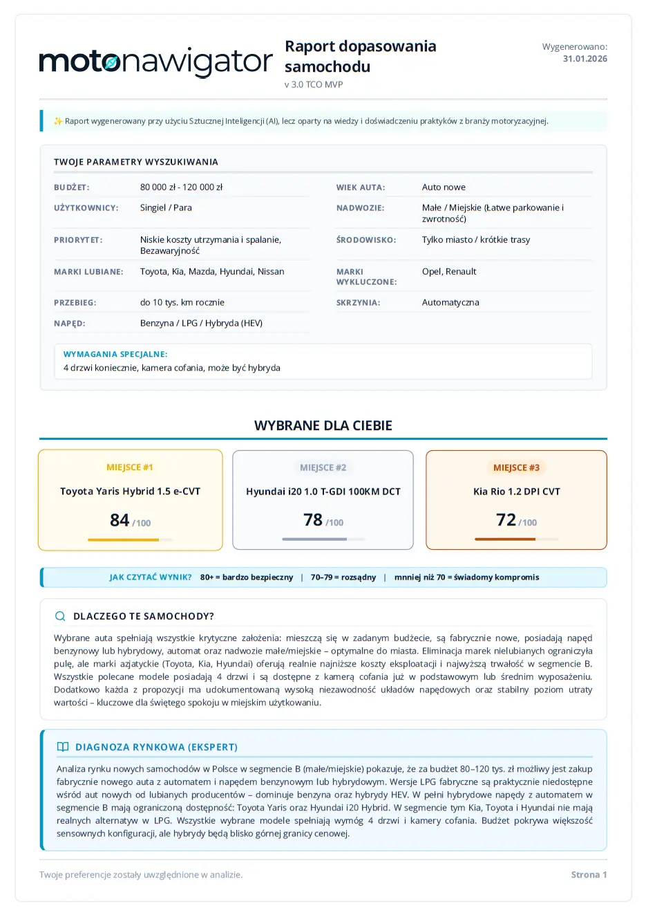 Za około 5 minut otrzymasz PDF z pełnym audytem finansowym TCO, oceną techniczną w 10 kategoriach i gotowymi linkami do ofert.
